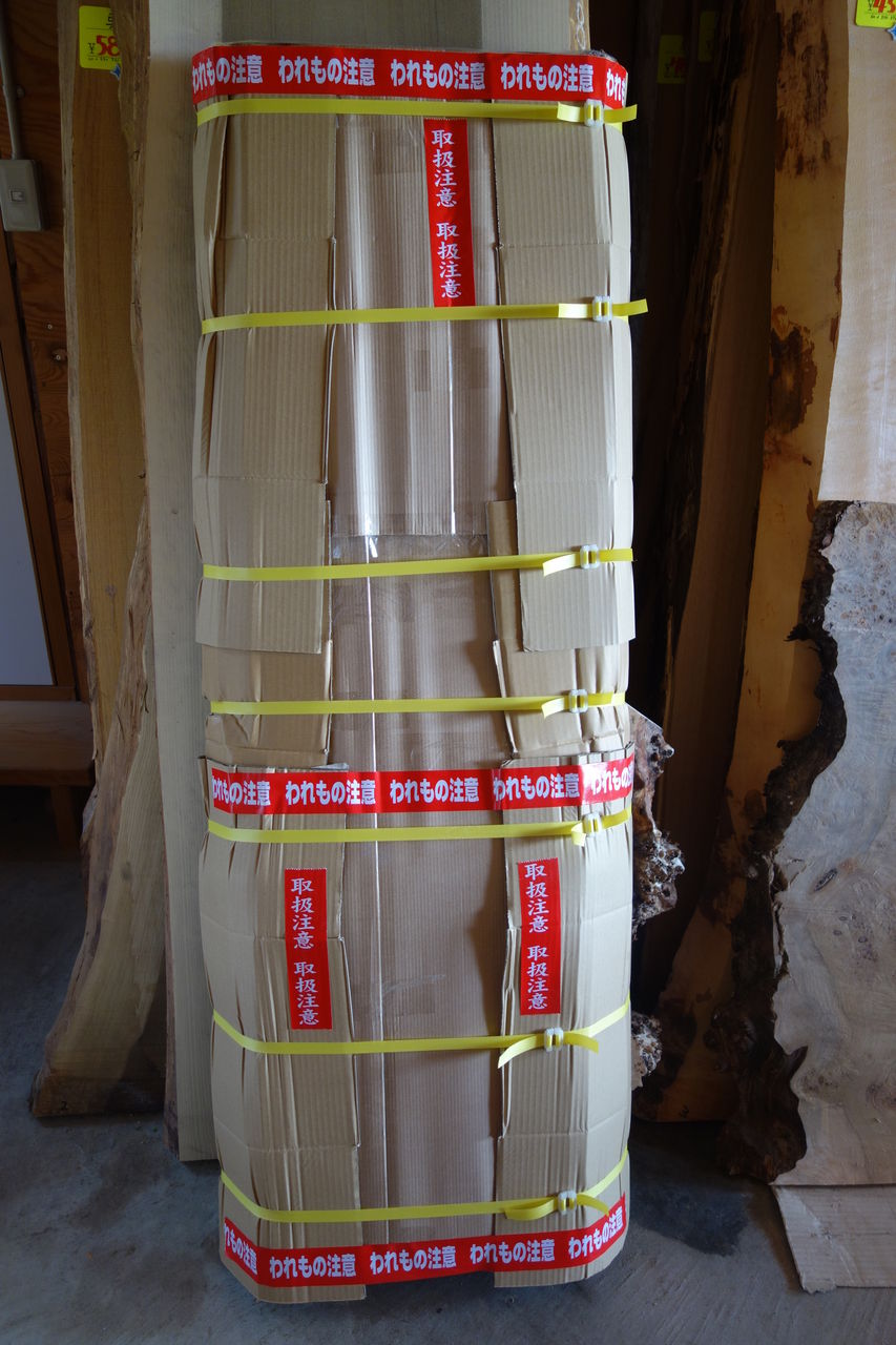 梱包する時もかなり気を使います。まずはエアーキャップで優しく一枚板を包みます。そしてその上から段ボールで包みます。段ボールは厚めの物を使用しています。そしてその上から耳の部分に4か所超厚めの段ボールを備え付けて完了です。耳の部分がキズが付かない様、細心の注意をはらっています。お陰様で今までお客様に届いてキズが付いたという事は殆ど皆無です。今日も午後から梱包があります。